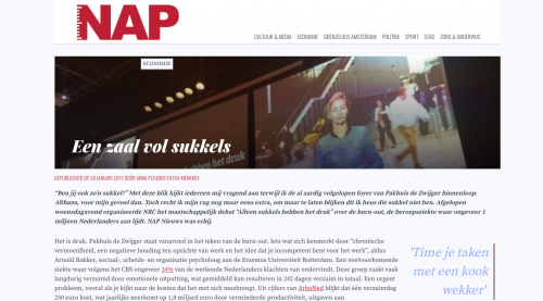 “Ben jij ook zo’n sukkel?” Met deze blik kijkt iedereen mij vragend aan terwijl ik de al aardig volgelopen foyer van Pakhuis de Zwijger binnenloop. Althans, voor mijn gevoel dan. Toch recht ik mijn rug nog maar eens extra, om maar te laten blijken dit ik heus die sukkel niet ben. Afgelopen woensdagavond organiseerde NRC het maatschappelijk debat “Alleen sukkels hebben het druk” over de burn-out, de beroepsziekte waar ongeveer 1 miljoen Nederlanders aan lijdt. NAP Nieuws was erbij.